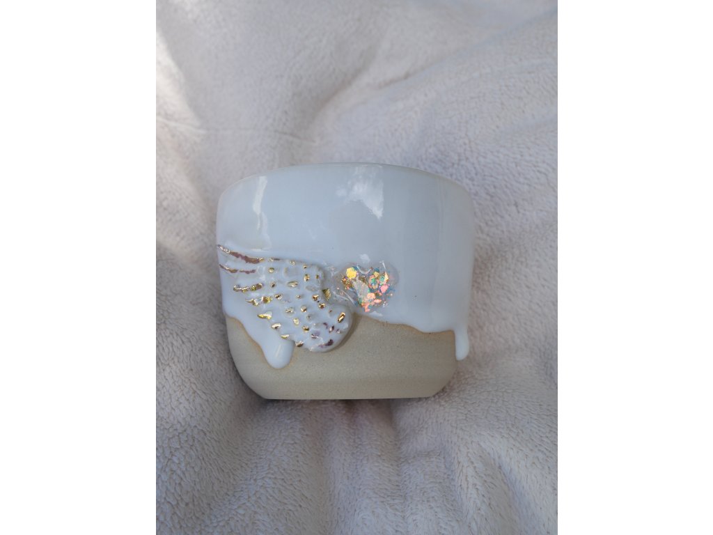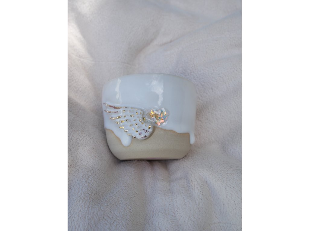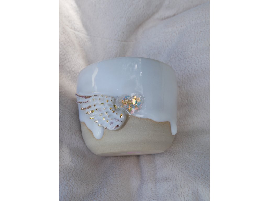 S ručně modelovaným srdíčkem zalitým zlatem a třpytkami a s něžným, andělským křidýlkem.