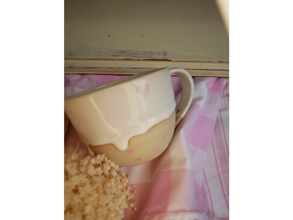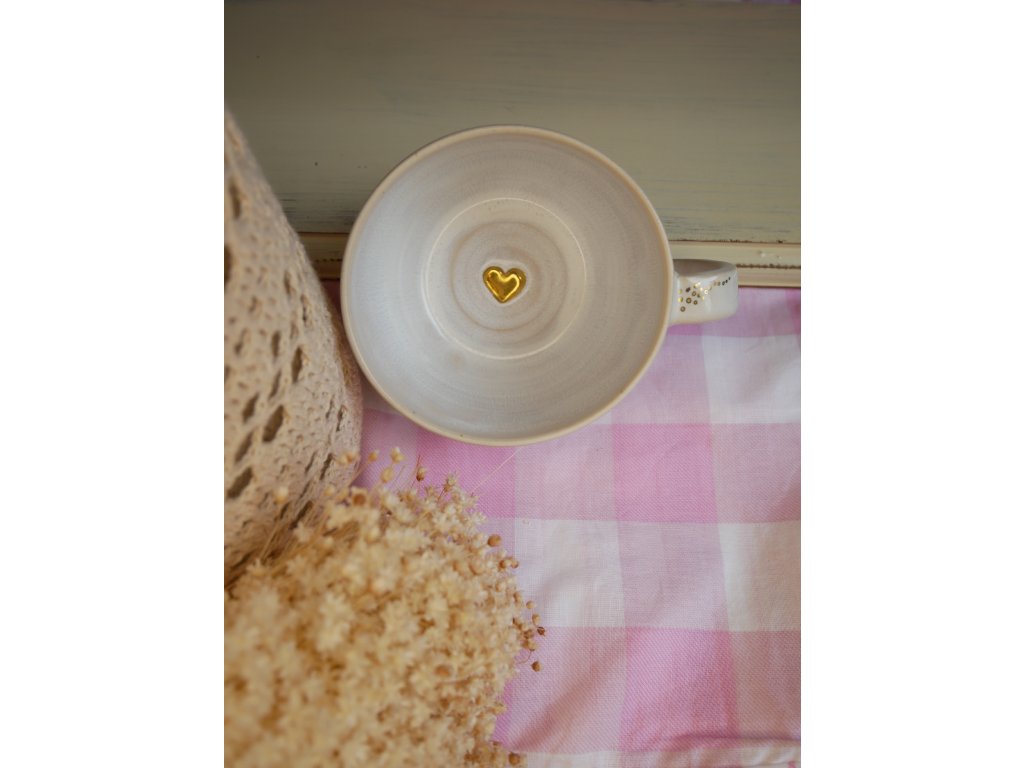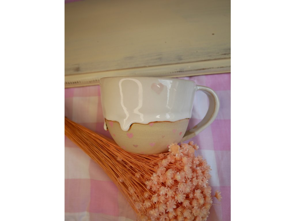 Ručně malovaný veselými srdíčky v odstínech růžové a fialkové . Po dopití nápoje na Vás vykoukne ručně modelované zlaté srdíčko ❤︎