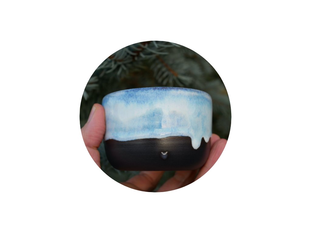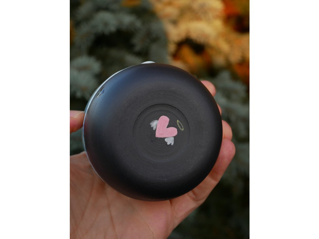 Za velké radosti a veselí vytočený kalíšek z černého porcelánu. Glazovaný namíchanými vysokoteplotními glazurami, doplněný zářícím srdíčkem ❤︎ a vodopádem :)